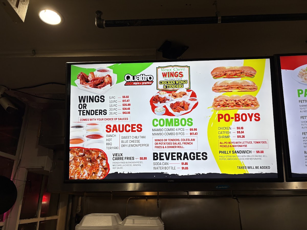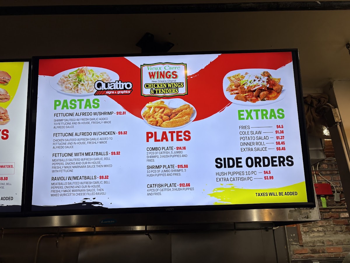 The menu at Vieux Carre Wingery offers a delightful variety of dishes perfect for anyone craving comfort food with a Southern twist. For beverages, you can enjoy a refreshing Soda (Can) or Water (Bottle). When it comes to sides, the restaurant serves Extra Catfish (1 Piece) and Hush Puppies (10 Pieces), both great additions to any meal. The pasta selection includes comforting options like Ravioli With Meatballs, Fettuccine Alfredo With Chicken, Fettuccine With Meatballs, and Fettuccine Alfredo With Shrimp. For those craving wings or tenders, there are multiple portion sizes to choose from, including Wings Or Tenders (10 Pieces), Wings Or Tenders (5 Pieces), Wings Or Tenders (15 Pieces), Wings Or Tenders (20 Pieces), and Wings Or Tenders (25 Pieces). If you're looking for a hearty plate, the Combo Plate, Shrimp Plate, and Catfish Plate are excellent choices. As for extras, you can enjoy Coleslaw, Fries, Extra Sauce, a Dinner Roll, and the signature Vieux Carre Fries. Whether you're in the mood for pasta, fried catfish, or wings, this menu has something to satisfy every craving at reasonable prices.